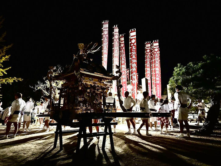その後、十月の二週目に五穀豊穣・氏子・地域の安泰の祭りとして、御神輿にだんじりを追従し、松永各町内を巡行する形で、現在の祭りが行われています。